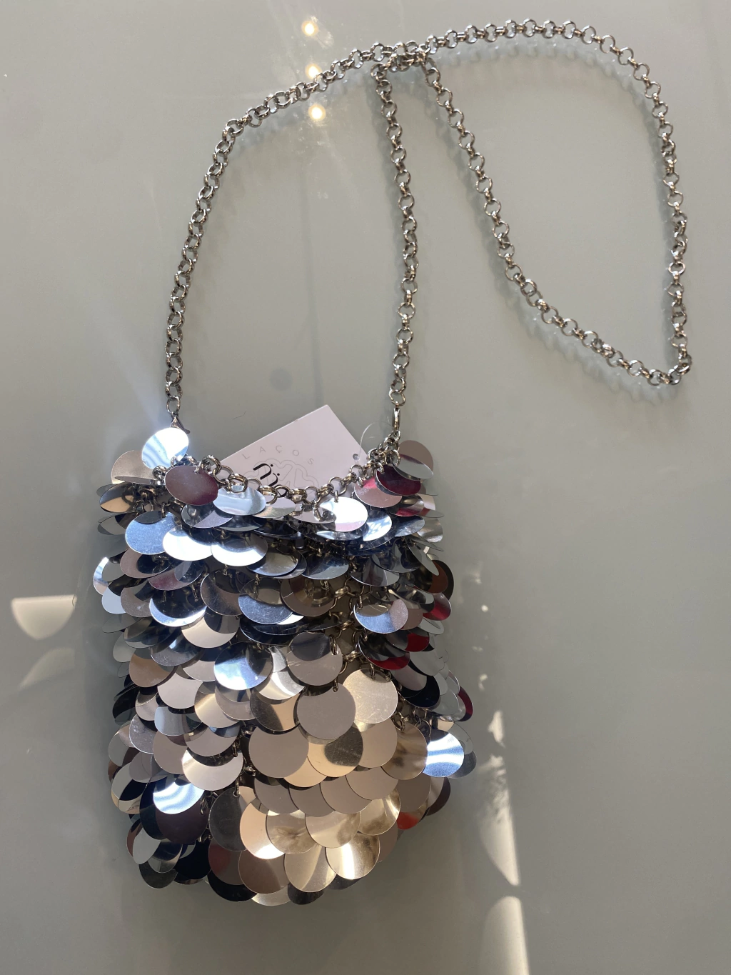 Bolsa pequena modelo saquinho em paetes espelhas com 2 tamanhos de alças.