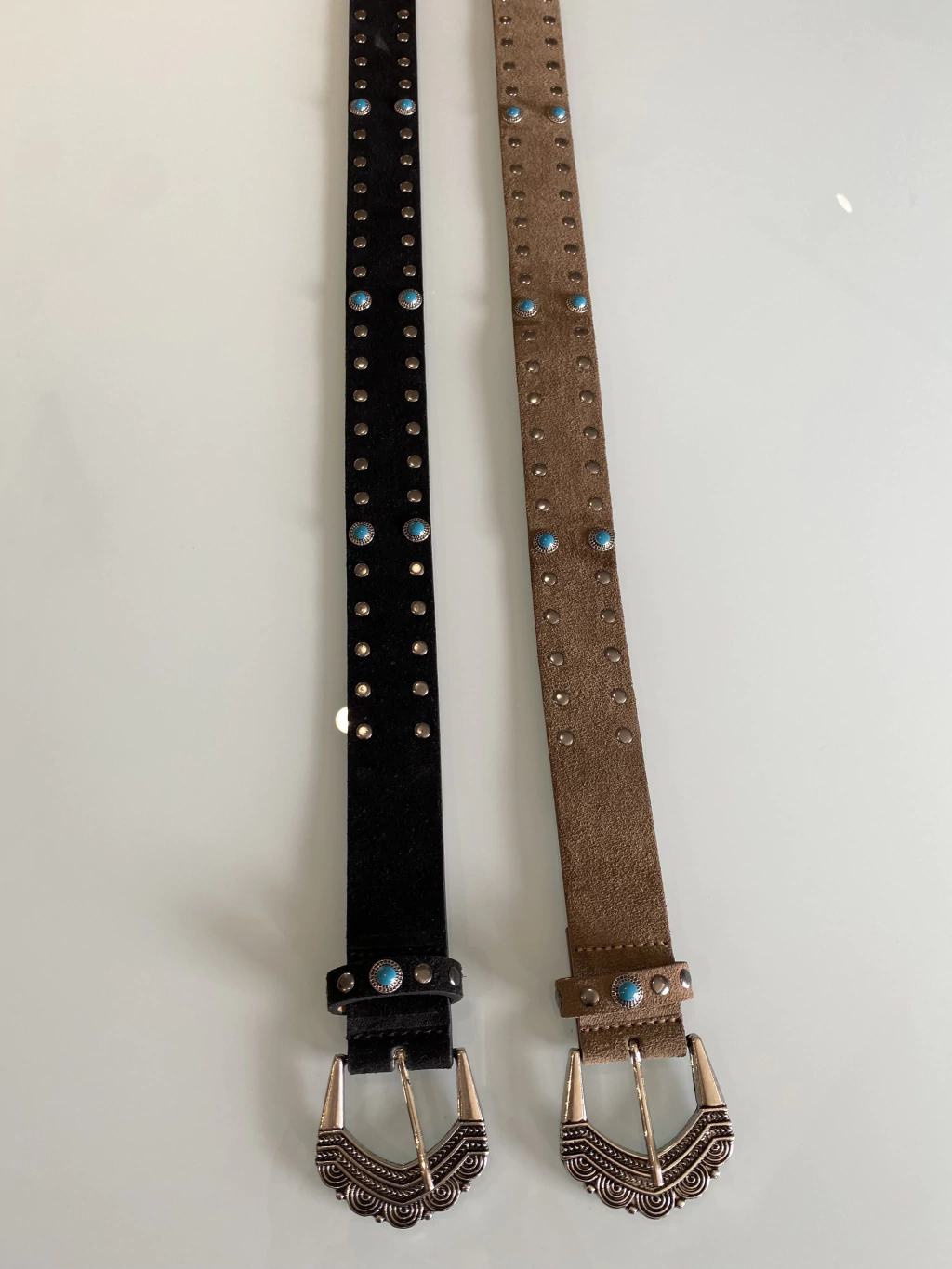 Cinto camurça, com aplicação de tachas e pedrarias ao longo da peça, fivela oval em metal.