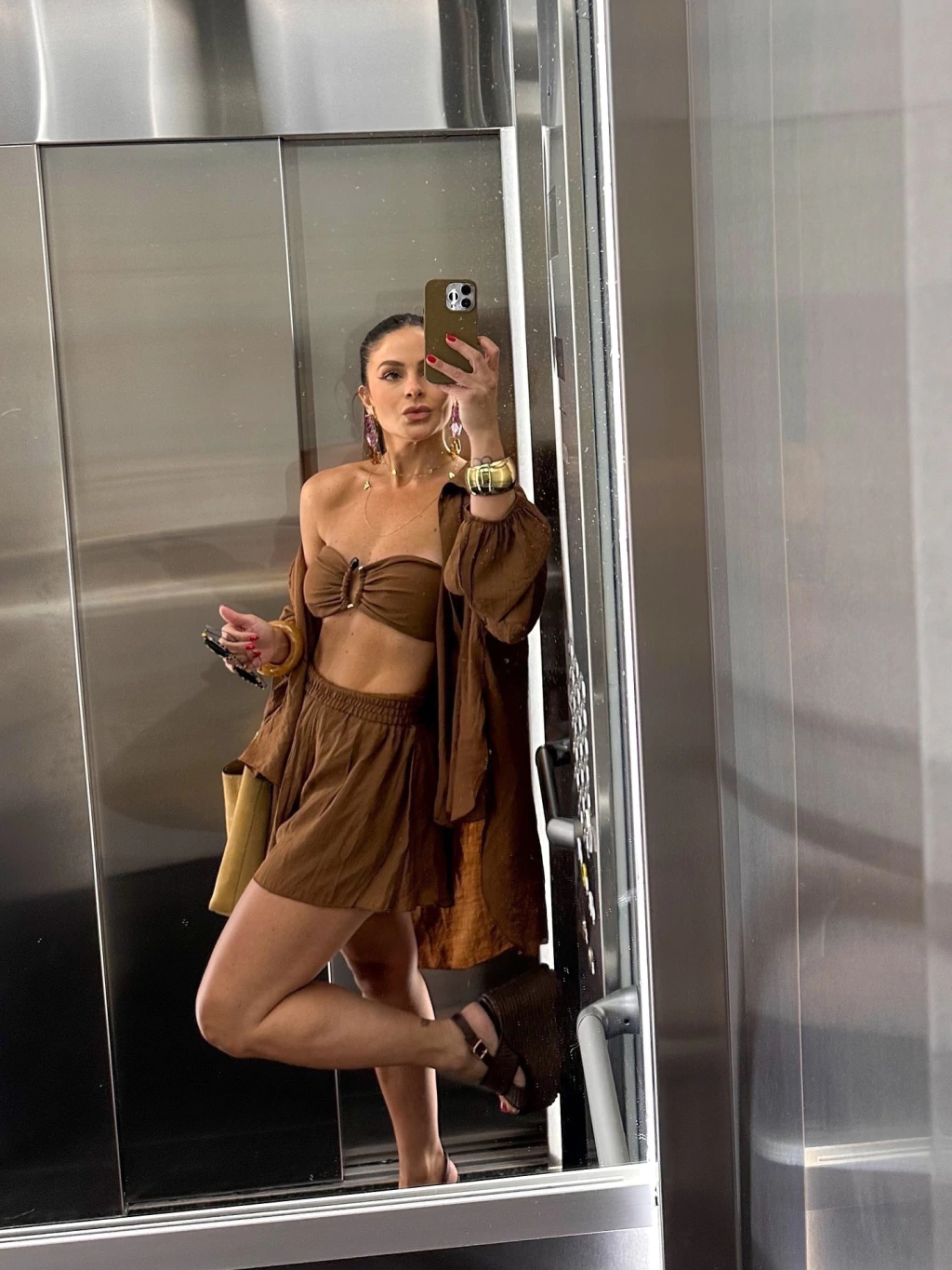 Conjunto 3 peças. Camisa ampla com a parte da frente mais curta, com elástico no punho. Shorts com elástico no cós, possuí forro na peça. Top com amarraçao frontal, sem alças.