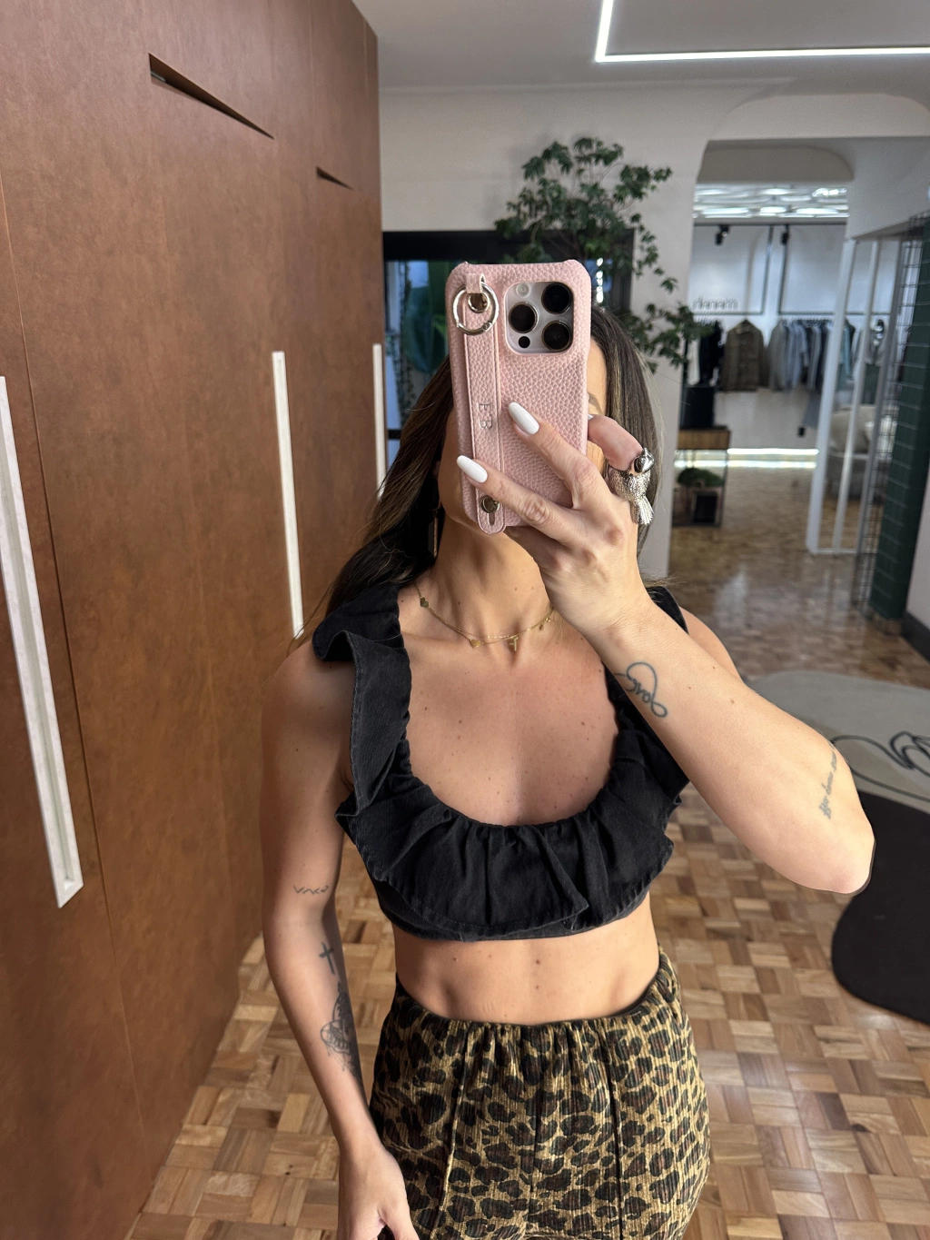 Cropped com babados, ombro a ombro fechamento na parte de tras em ziper.