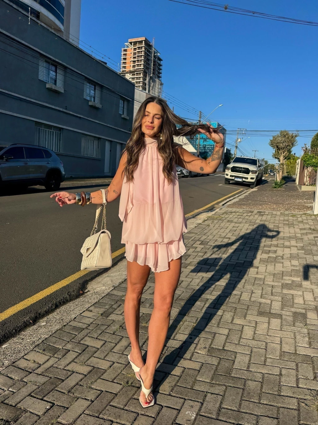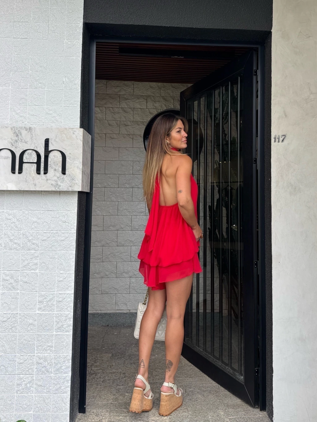 Macaquinho fluido com elástico na cintura, com amarraçao no pescoço, costas abertas.