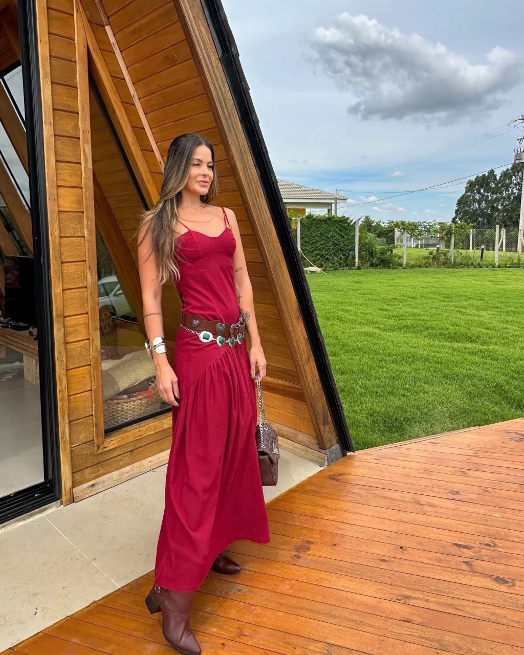 Vestido midi com busto meia taça e saia fluída. Fechamento em zíper nas costas.